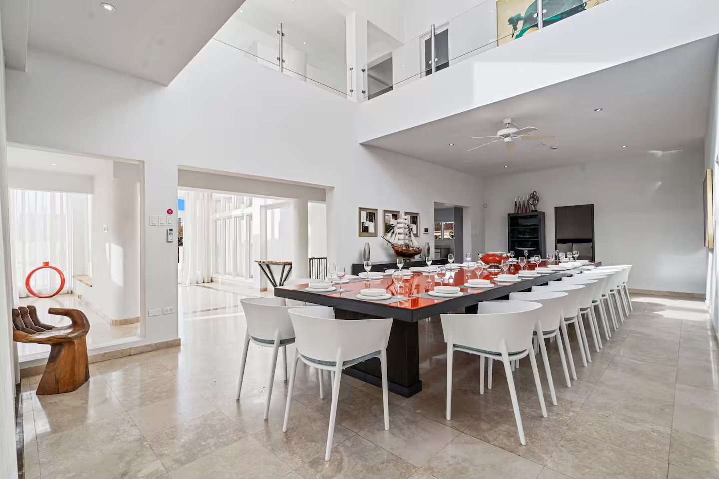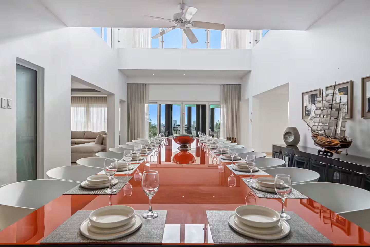 Gather around a spacious dining table with seating for eight, set beneath ambient lighting. The perfect setting for shared meals, celebrations, or an intimate island dinner.